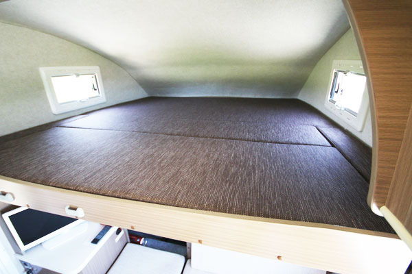 運転席上部のバンクベッドです。サイズは1,870mm×1,870mmと大人でも2名就寝可能です。脱落防止ネットも付いているので安心ですね。